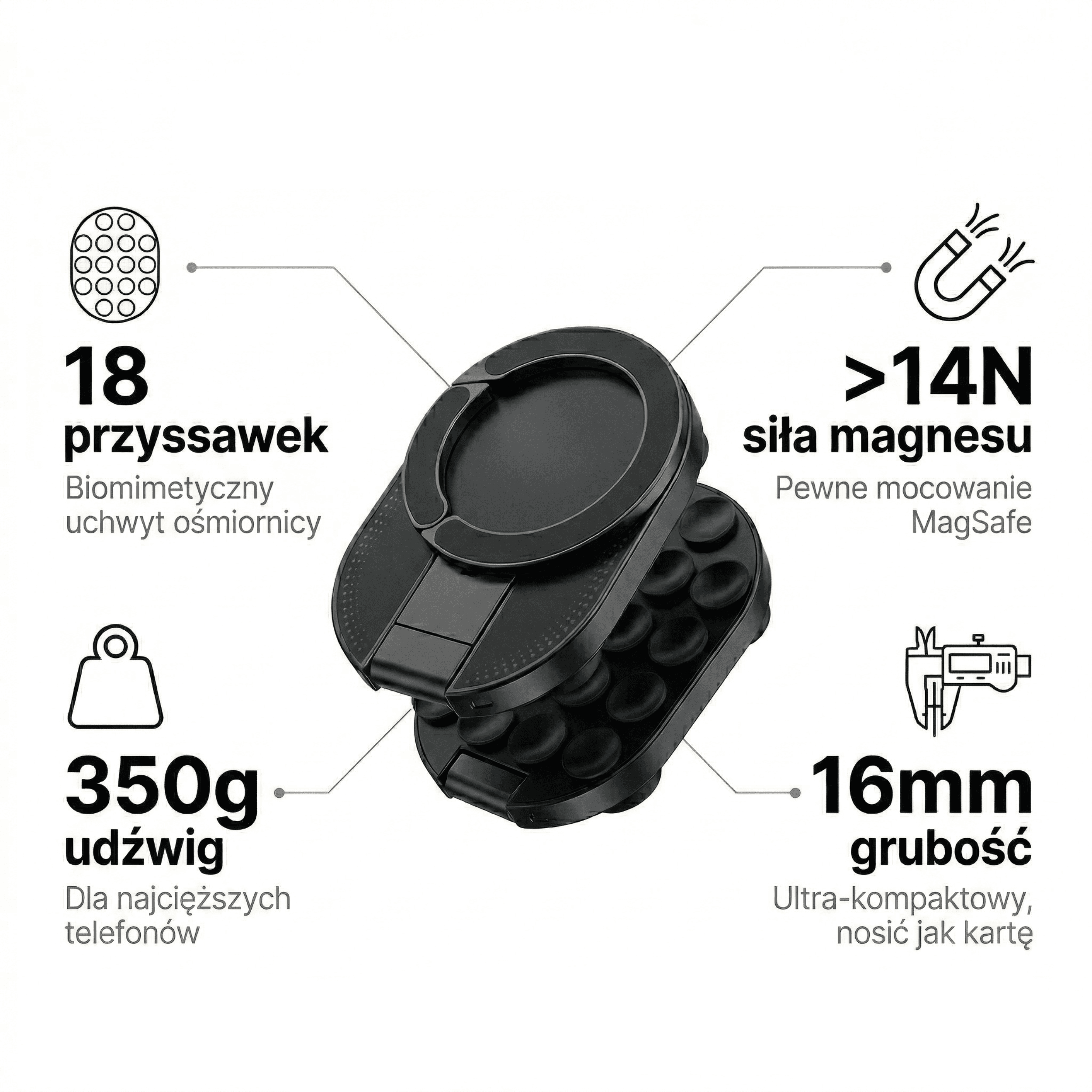 Każdy parametr został przemyślany do ostatniego milimetra. 18 przyssawek inspirowanych budową macek ośmiornicy trzyma się pewnie na każdej gładkiej powierzchni. Magnes o sile ponad 14N blokuje natychmiastowo telefon. Udźwig 350g oznacza, że poradzi sobie z każdym smartfonem. Wszystko zamknięte w obudowie grubości zaledwie 16 mm